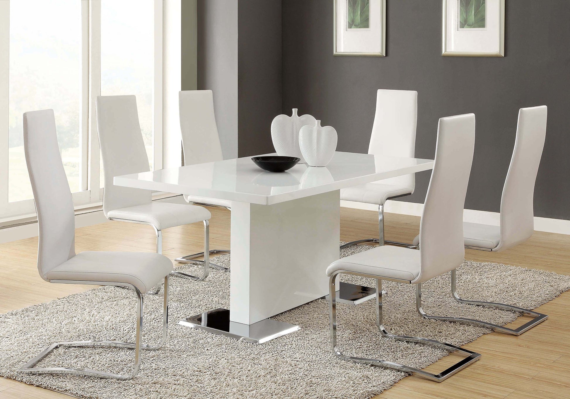 - Contemporary dining group with unique chrome finish bases in the foot of the table and chairs