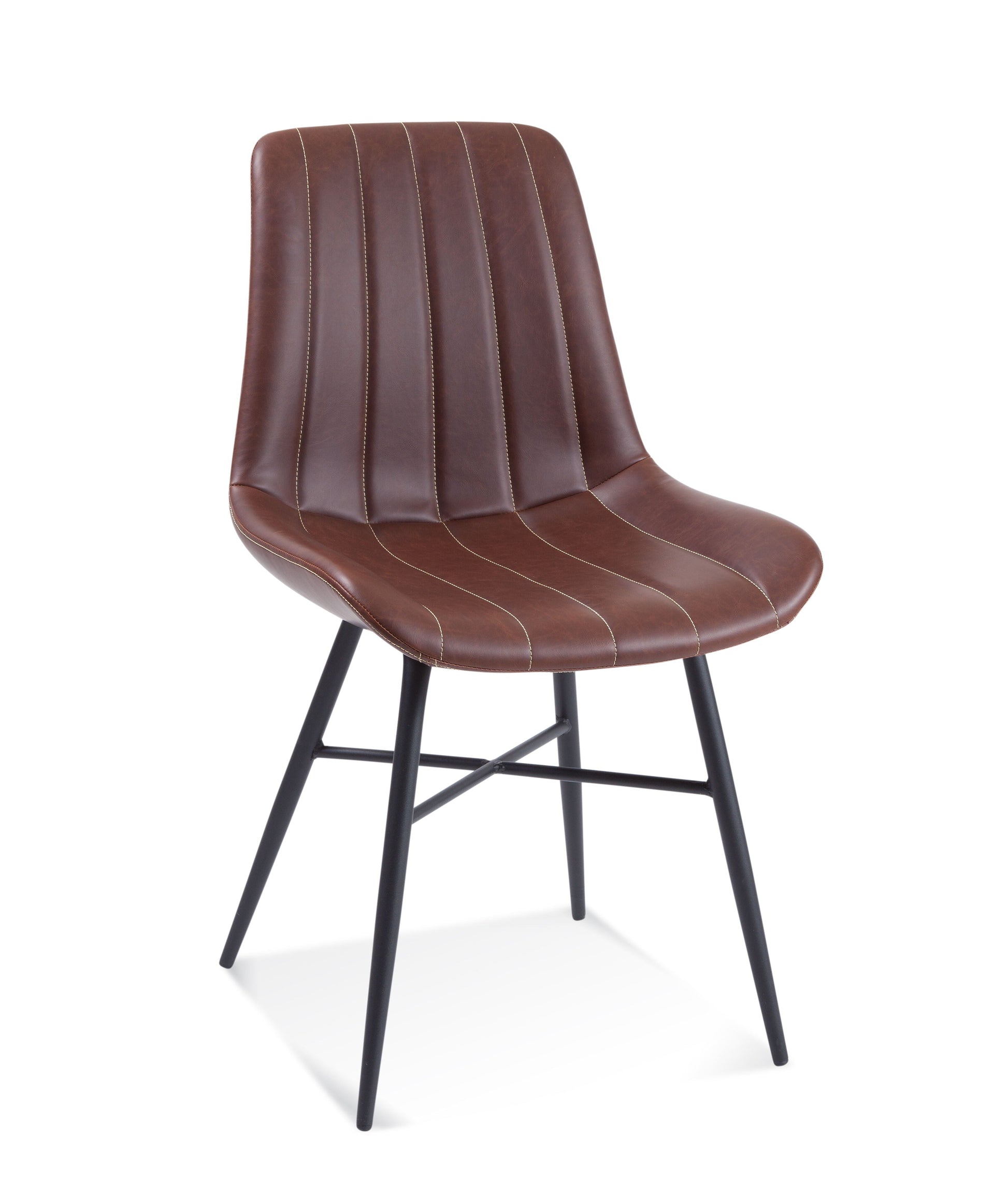 The Dylan Side Chair is a modern channel back chair with angled legs and an X detail base. Finish: black and brown. Drive in floor glides on the leg bottom. High density foam seat cushion. Material: PU, steel.