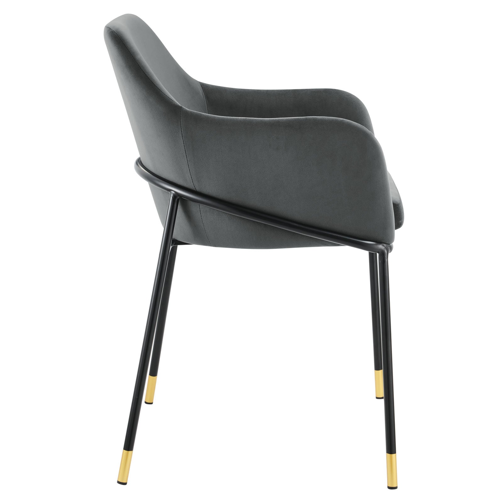 The clean lines and smooth curves of the Jovi Performance Velvet Dining Armchair unite to make this a stylish addition to your dining room or an alluring accent in your living room or hallway. Minimalism meets glam deco style to create this tasteful dining chair that complements your mid-century, modern, or transitional decors. This retro modern dining chair rests on black powder-coated metal legs with gold accents that blend beautifully with the stain-resistant performance velvet upholstery. The captivating curves of the arms and back convey movement while the padded seat cushion evokes restfulness. The Jovi Performance Velvet Dining Armchair comes with non-marking foot pins to protect your flooring.