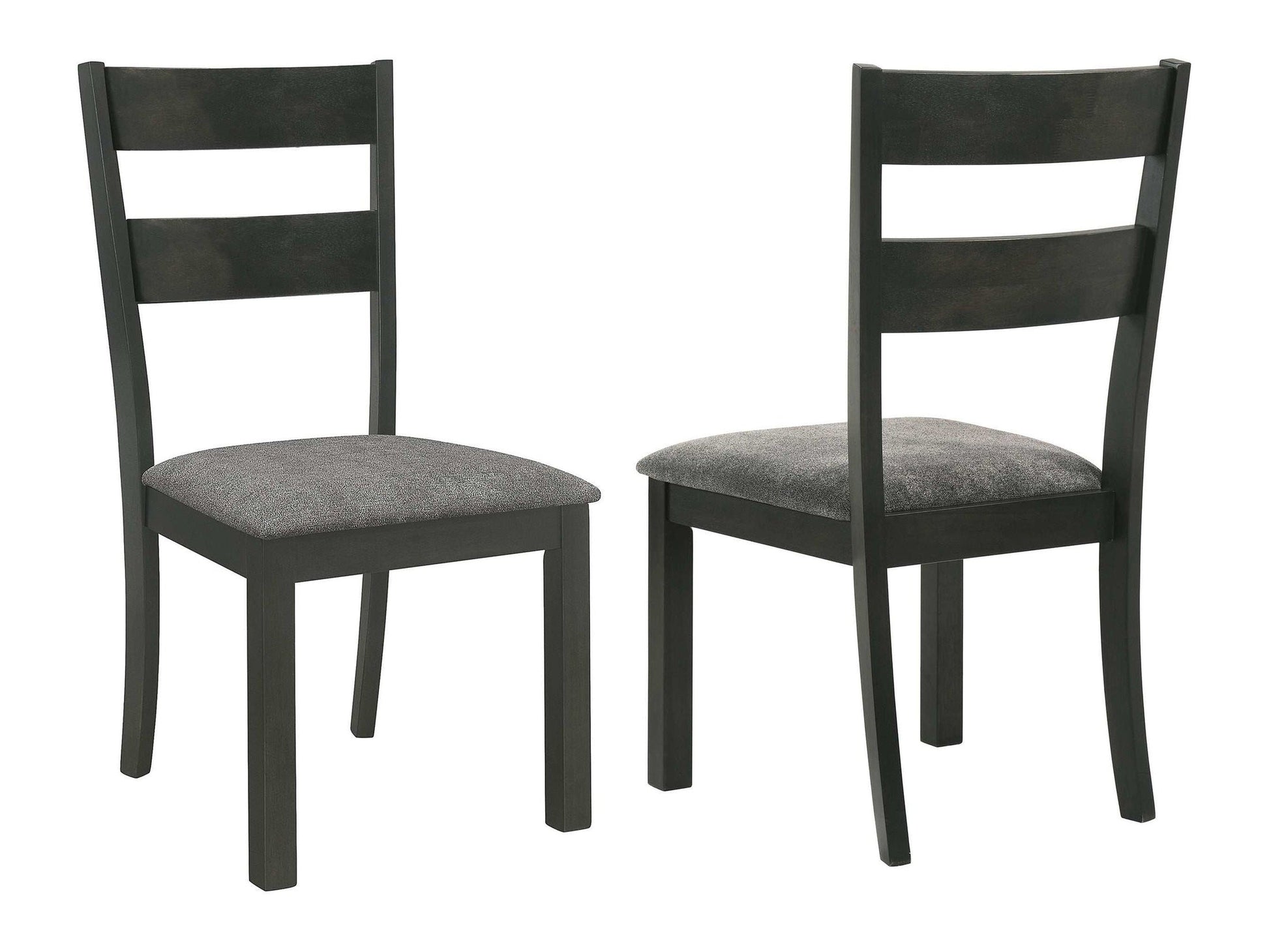 Simple, yet elegant, this transitional ladder back side chair offers a comfortable place to rest while dining with family and friends. A padded seat upholstered in a soft grey fabric creates a smooth surface for kids and adults. Designed with a deep black stain finish, this chair offers a bold look to a space. In addition, straight block-like front legs and slightly flared back legs elevate the seat. Slide this sleek dining chair up to a casual dining table in a modern farmhouse style space or contemporary home.