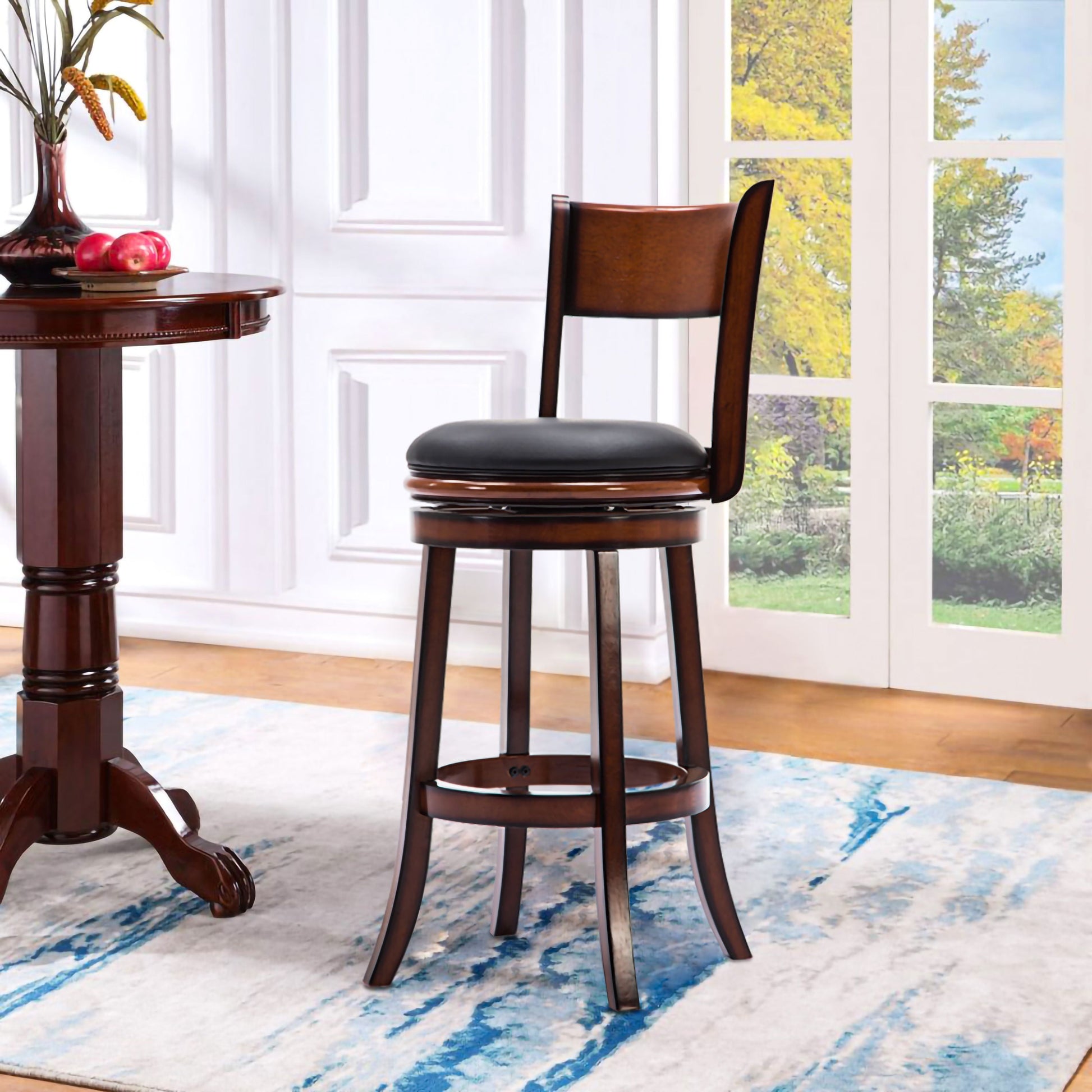 The Wooden Swivel Counter Height Bar Stool is ideal for a bar or dining room. This incredibly beautiful and cozy bar stool is also the ideal height for tall counter tops. The Counter Height Bar Stool has a completely swiveling seat coated in plush black vinyl for a modern appearance and is also made of solid hardwood.